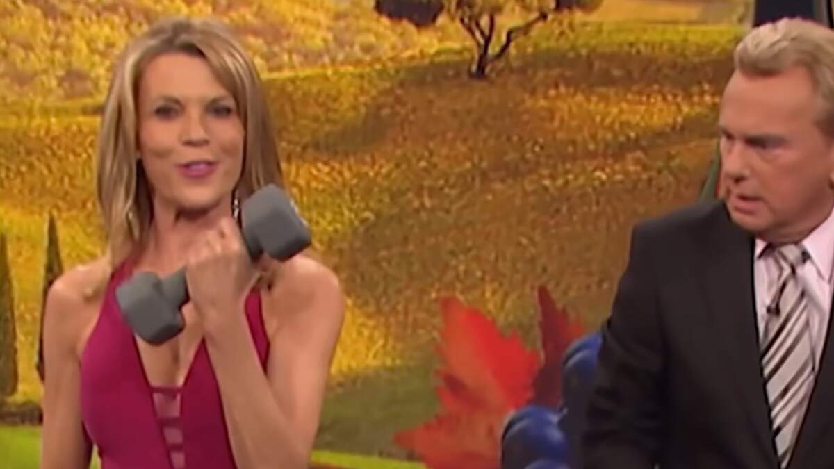 It happened after Pat complimented how great Vanna looks and told the audience about "a little ritual" she performs before each show. He then ran off-screen and got "help" to carry a pair of 10 pound dumbbells over to Vanna, who then started doing curls with them, explaining it is what she does before every show.